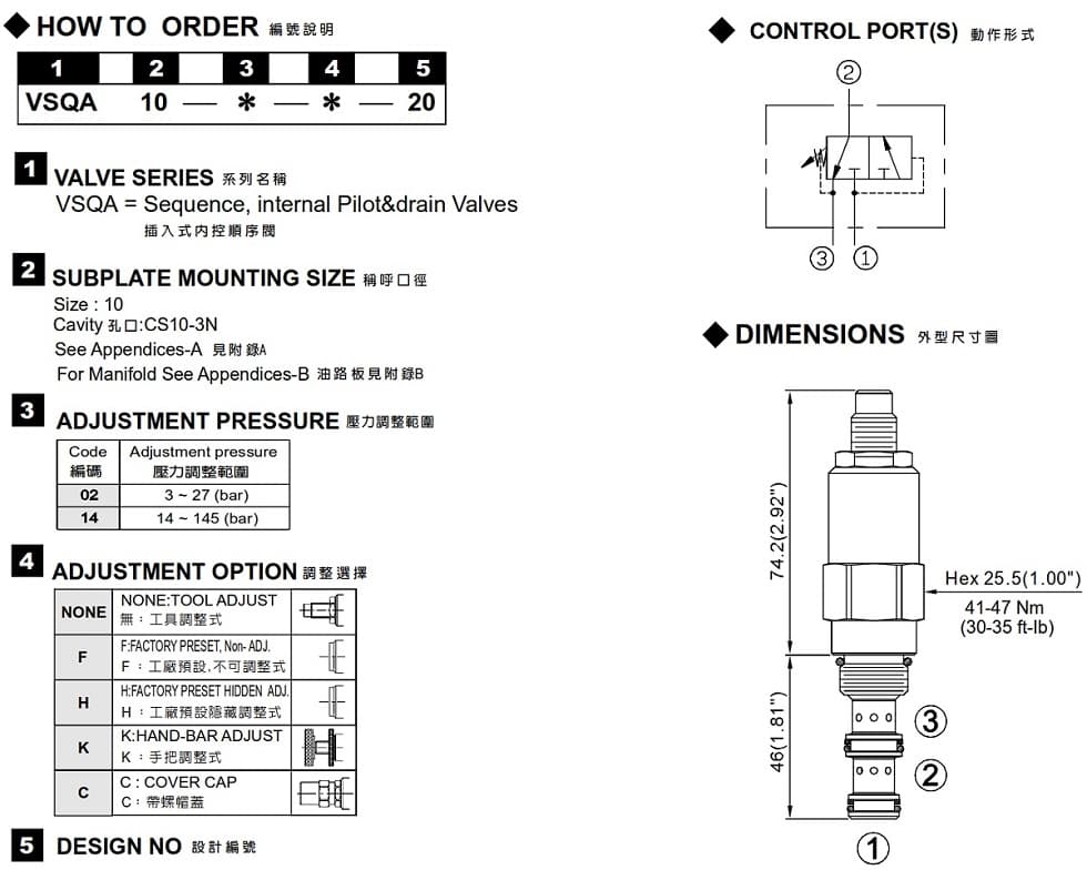- In its steady state, the VSQA-08 blocks flow at ①, while allowing flow to pass from ② to ③