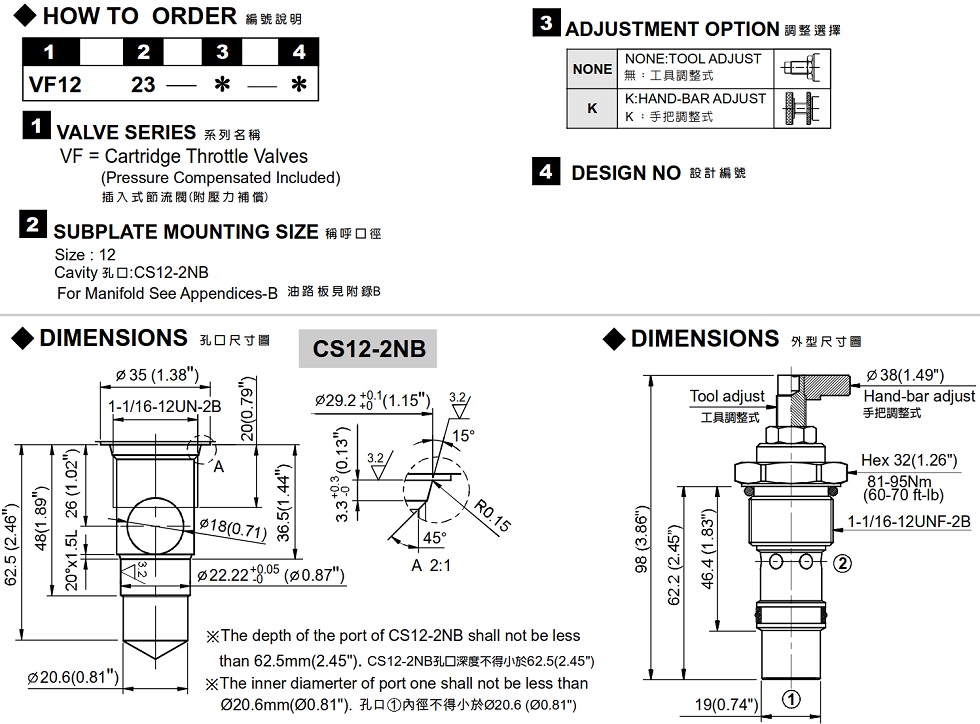 | VF12-23 | 350 (5076 psi) | 250 (3625 psi) | 0,1 bis 77 (0,03 bis 20,34 gpm) | 0,25 (0,55 Pfund) |