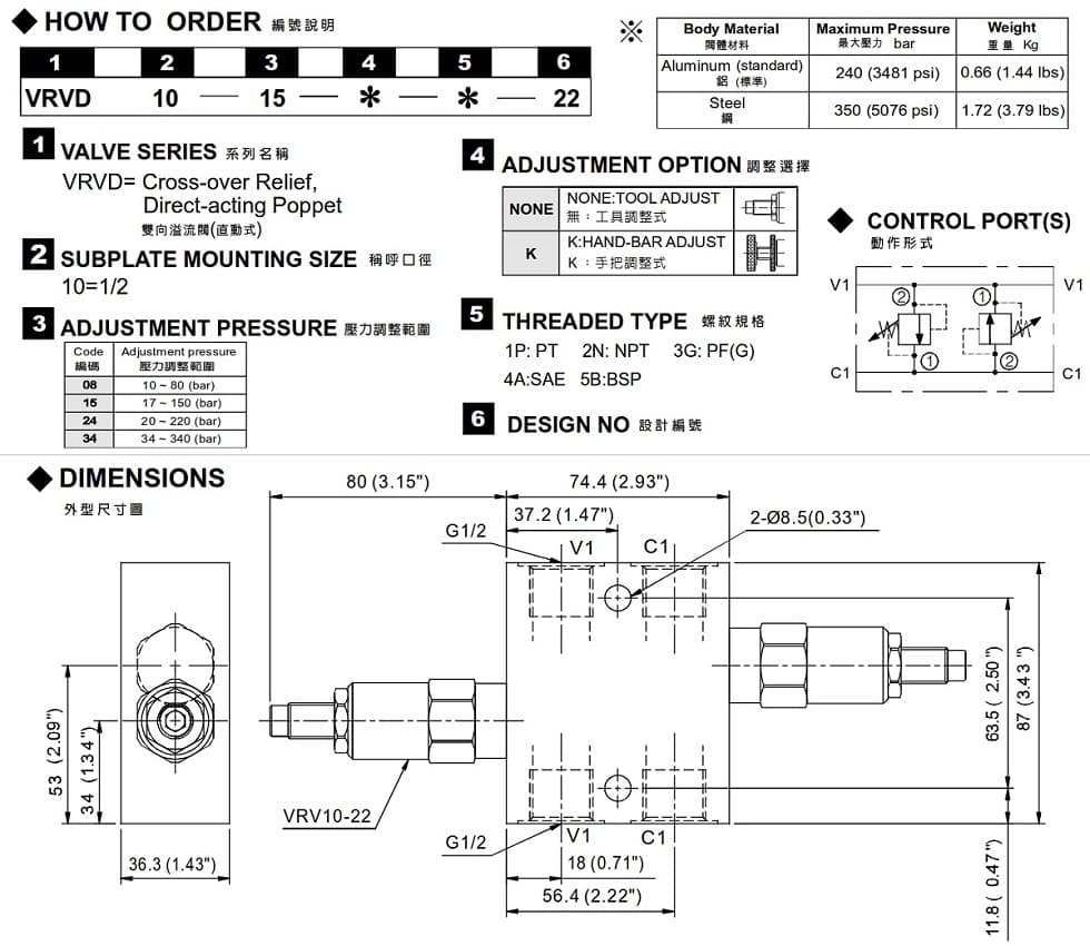 | VRVD10-22 | 340 (4931 psi) | 70 (18,49 gpm) | 2,5 (5,51 Pfund) |