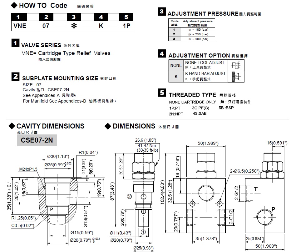 | 型式號碼 | 最大壓力 (bar) | 最大流量 (lpm) | 重量 (kg) |
