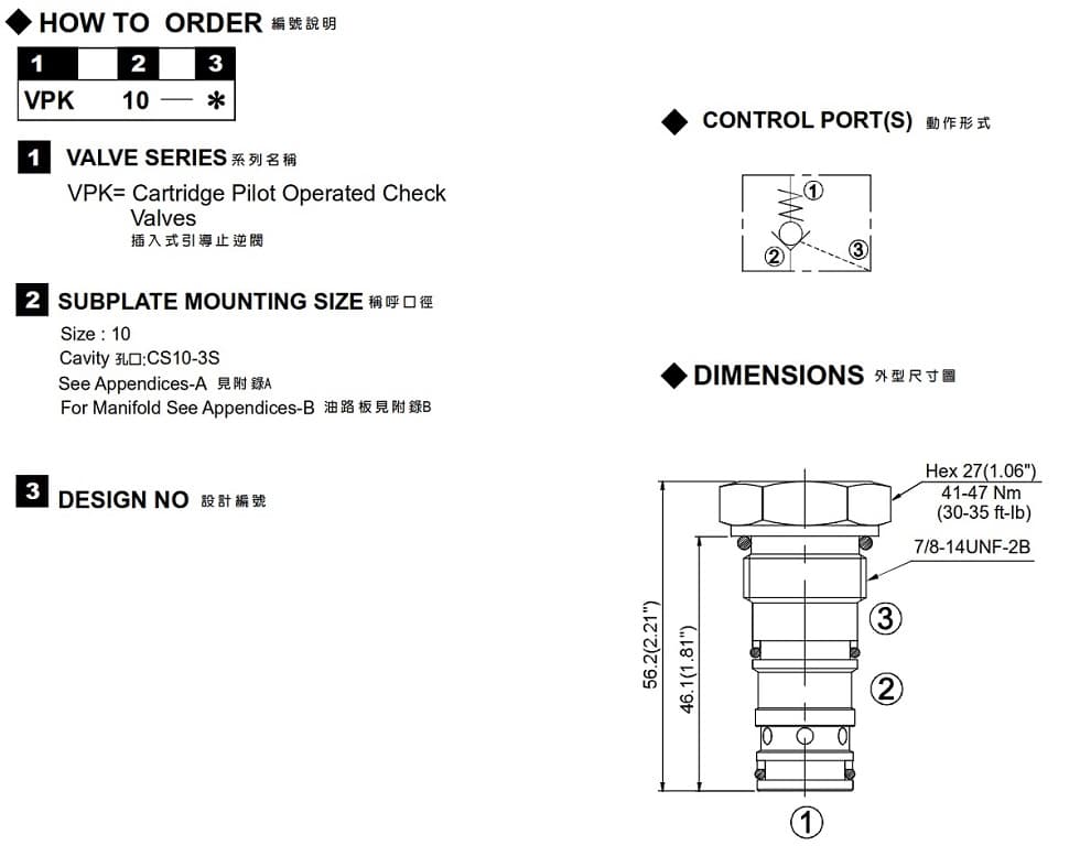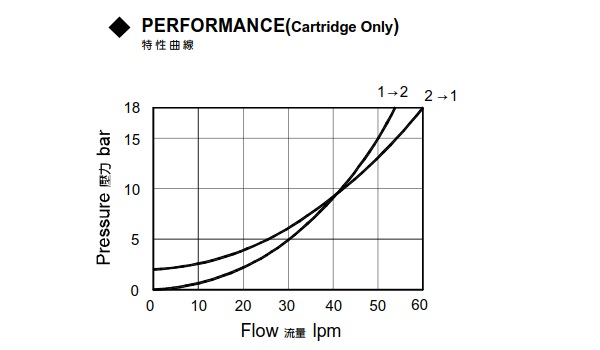 | 型式號碼 | 最大壓力 (bar) | 開啟壓力 (bar) | 引導比例 | 最大流量 (lpm) | 重量 (kg) |