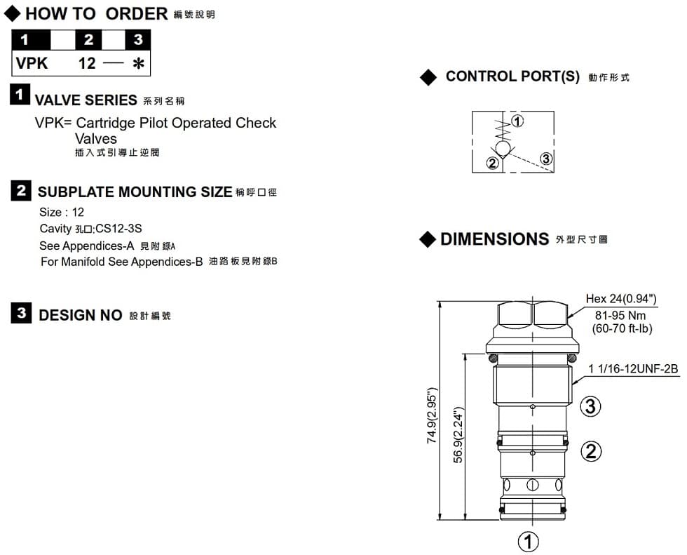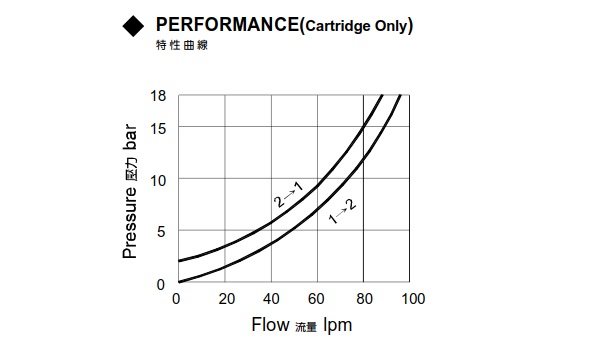 | 型式號碼 | 最大壓力 (bar) | 開啟壓力 (bar) | 引導比例 | 最大流量 (lpm) | 重量 (kg) |