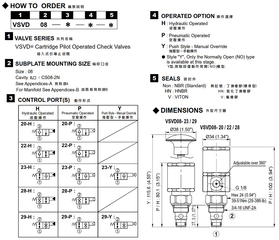 | VSVD08-*-H | 350 (5076 psi) | 液壓 | 2 ~ 50 (29~725 psi) | 40 (11gpm) | 0.3(0.66 Ibs) |