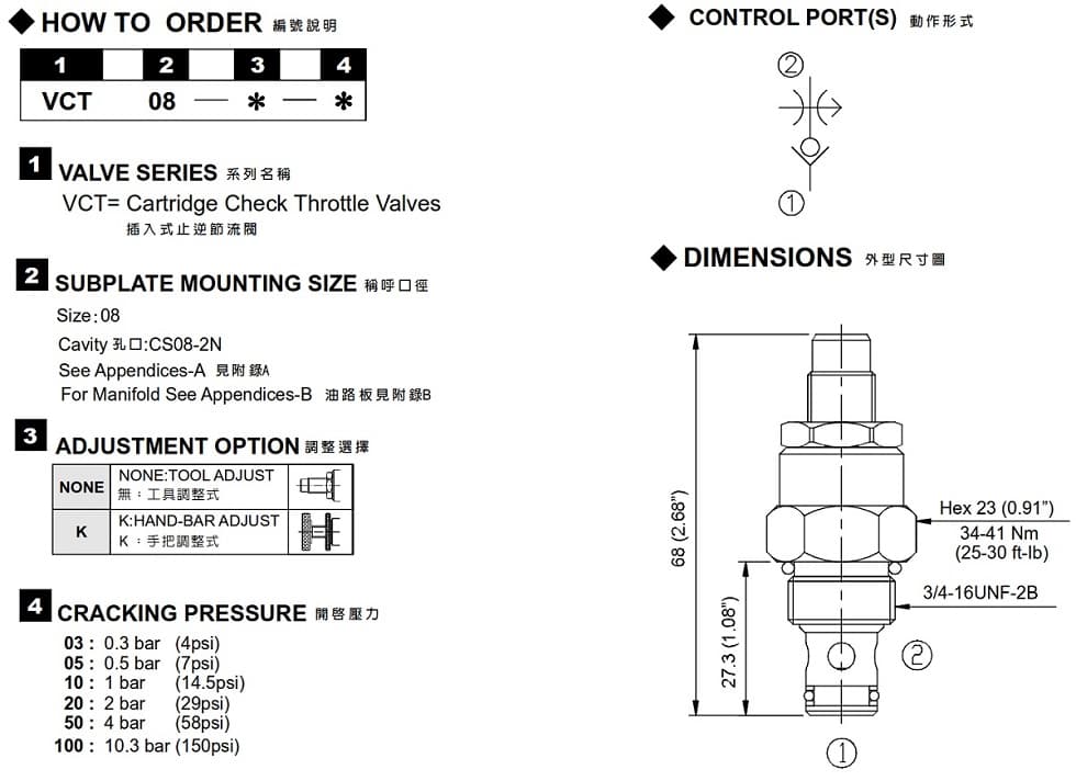 | VCT-08 | 350 (5076 psi) | 30 (7.93 gpm) | 0.13 (0.29 lbs) |