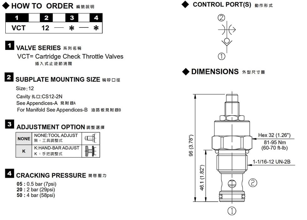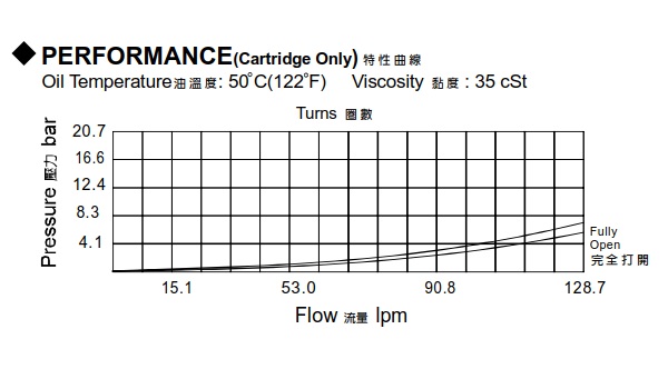 | 型式號碼 | 最大壓力 (bar) | 最大流量 (lpm) | 重量 (kg) |