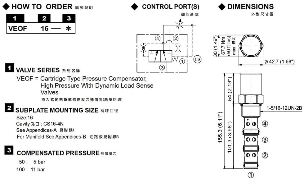 | VEOF-16 | 350 (5000 psi) | 190 (50.19 gpm) | 0.7 (1.54 lbs) |
