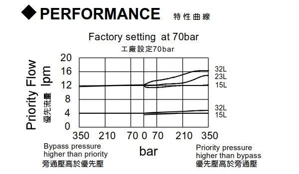 | 型式號碼 | 操作壓力 (bar) | 最大流量 (lpm) | 優先流量規格 (lpm) | 重量 (kg) |