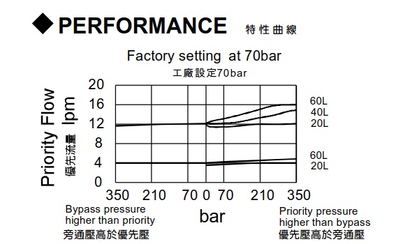 | 型式號碼 | 操作壓力 (bar) | 最大流量 (lpm) | 優先流量規格 (lpm) | 重量 (kg) |