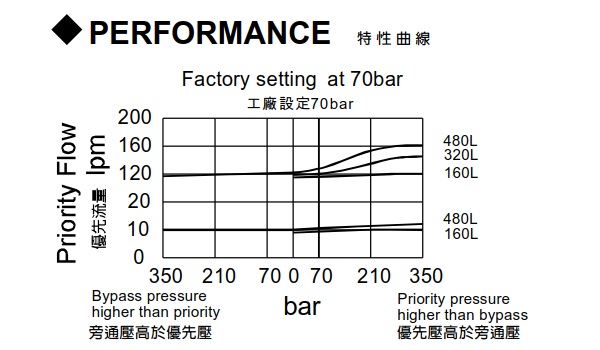 | 型式號碼 | 操作壓力 (bar) | 最大流量 (lpm) | 優先流量規格 (lpm) | 重量 (kg) |
