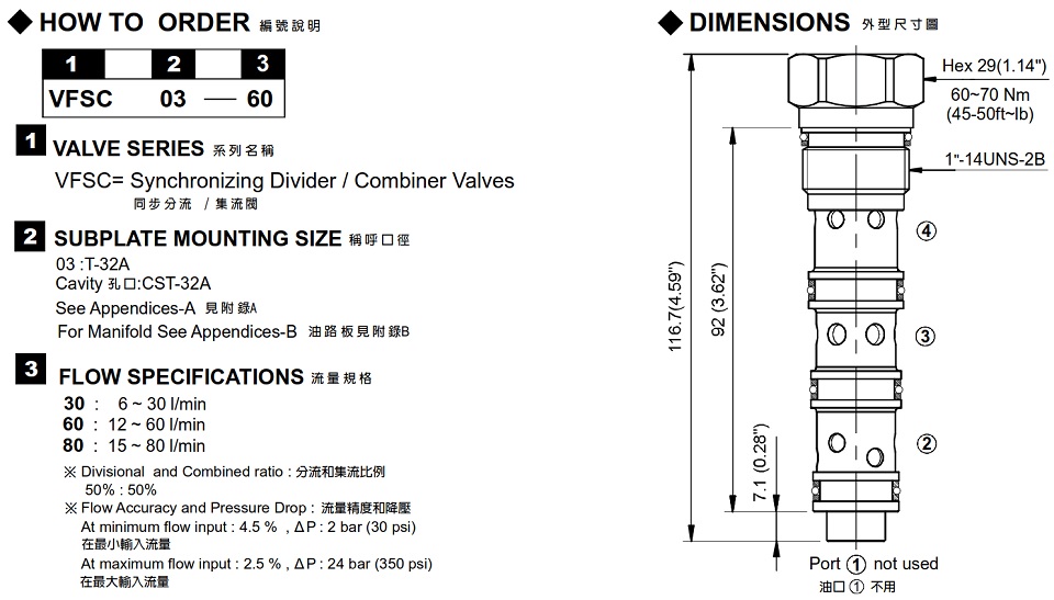 | VFSC-03 | 350 (5076 psi) | 12~80 ( 3.17~21.13 gpm) | 0.3 (0.68 Ibs) |