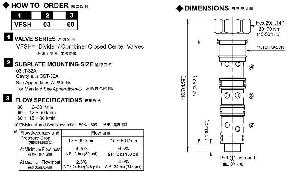 | VFSH-03 | 350 (5076 psi) | 12 ~ 80 ( 3.17 ~ 21.13 gpm) | 0.3 (0.68 Ibs) | ||
