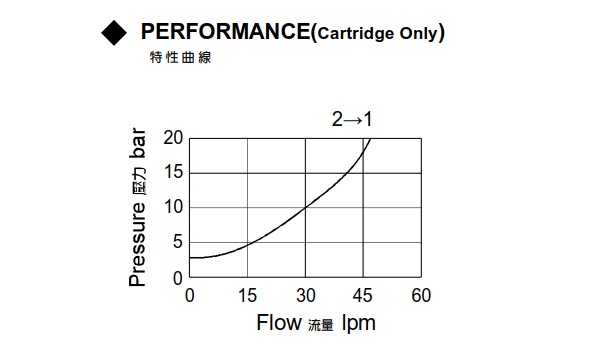 | 型式號碼 | 最大壓力 (bar) | 開啓壓力(bar) | 最大流量 (lpm) | 控制流量 (lpm) | 重量 (kg) |