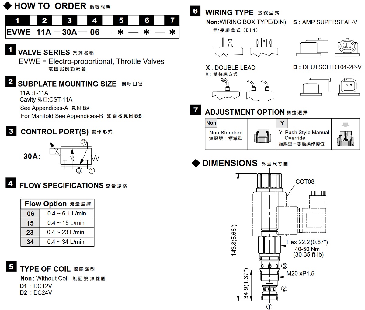 | 型式號碼 | 最大壓力 (bar) | 最大流量 (lpm) | 最大電流 (mA) | 電壓 (VDC) | 重量 (kg) |